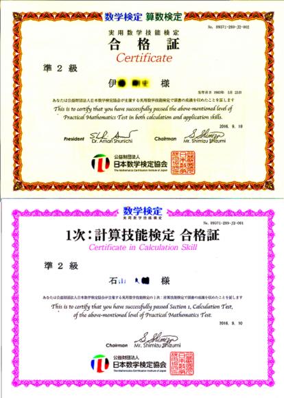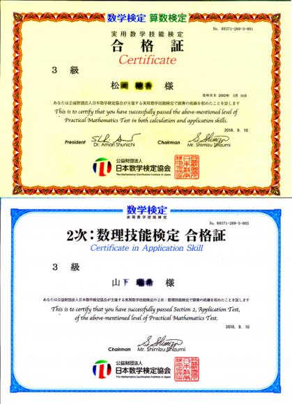 こんにちは、学研CAIスク-ルです。 8月実施の数学検定の結果です。 受験者全員合格(1次。2次合格含む)しました。 みんな、よく頑張りましたね。 特に中3生は内申に反映します、 今回受験しなかった 3年生も、もう1回チャンスがあります、 是非挑戦して下さい。 数検も漢検、英検もそうですが 勉強して合格した子供たちは その後の授業態度が変わります。 ご家庭の皆さん、お子様のモチベ-ション アップに 各種検定試験をご利用下さい。 I君 I君 すごい 準2級合格 Mさん Yさん 3級合格おめでとう 10月に1次再挑戦だ K君 K君 まだ学校で勉強していない範囲、頑張りました T君 O君 まだ学校で勉強していない範囲でも好きだから 頑張れますね