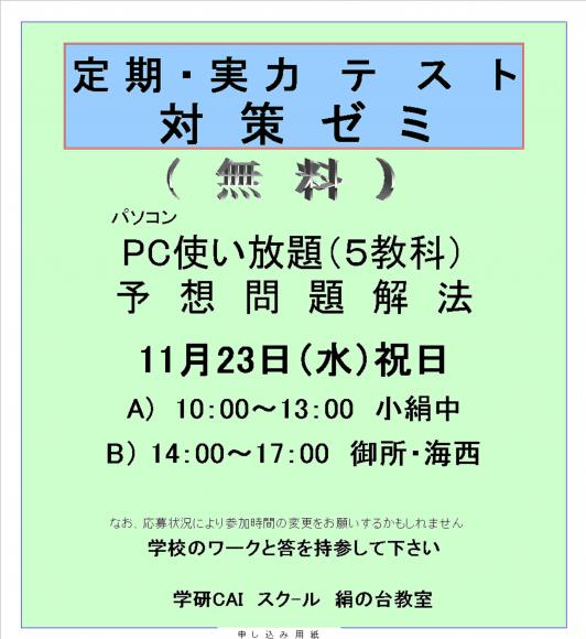 2016年11月14日 月曜日 つくばみらい・守谷・常総:無料期末対策ゼミ ( 教室からのお知らせ )
