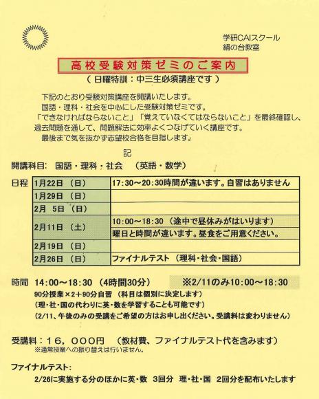 2017年01月21日 土曜日 県立入試必勝 日曜特訓=理社=開催 ( 教室からのお知らせ )