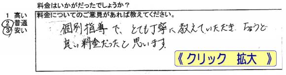 《 画像は、クリックすると拡大します 》 28年度:卒業生へのアンケ−ト Oさんのお母さん ★ 料金は、いかがだったでしょう。 『個別指導で、とても丁寧に教えていただき、ちょうど良い 料金だったと思います。』 ★ 進路や勉強に対するアドバイスは如何だったでしょうか。 『テスト対策等、家ではなかなか勉強がはかどらない時に 自習も使用させてもらい、良かったです。』 ★ スタッフの日々の対応は如何だったでしょうか。 『親には相談できない事なども対応していただき とても助かりました。』 ★ おこさまを通塾させて頂いた感想をお聞かせ下さい。 『小学生から通い始め、《 塾に行きたくない 》と言った事は 一度もありませんでした。勉強が好きという子ではなかった けれど、塾ではきちんと勉強していたので、良い習慣になった のではないかと思います。』 ありがとうございます、皆様に満足頂けるよう さらに努力して参ります。
