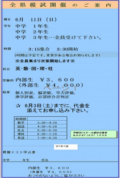 茨城全県模試開催のお知らせ:中学生 ( 教室からのお知らせ )