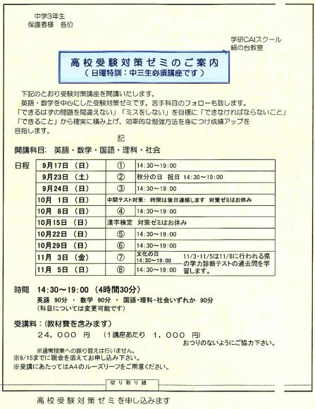 2017年09月06日 水曜日 受験対策ゼミ:日曜特訓、開催のお知らせ ( 教室からのお知らせ )