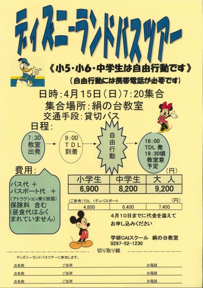 2018年04月13日 金曜日 30年東京ディズニ-ランド・バスツア-開催のお知らせ ( 教室からのお知らせ ) |
