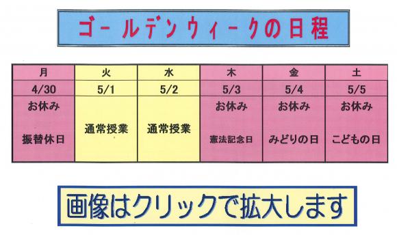 『 ゴ-ルデン ウィ-ク 期間の日程のついて 』 ゴ-ルデン ウィ-ク 期間 (4/30〜5/5) は、カレンダ-どおり祭日は休講です。 振り替え等についての詳細は各自に お渡しした、お知らせの通りです。 5月7日(月)から通常日程の授業を行います。 【 緊急のご連絡 】はお電話で教室まで ご連絡ください。 中学生は、5月になるとすぐ、中間試験が あります。復習もして下さい。 《 画像は、クリックすると拡大します 》