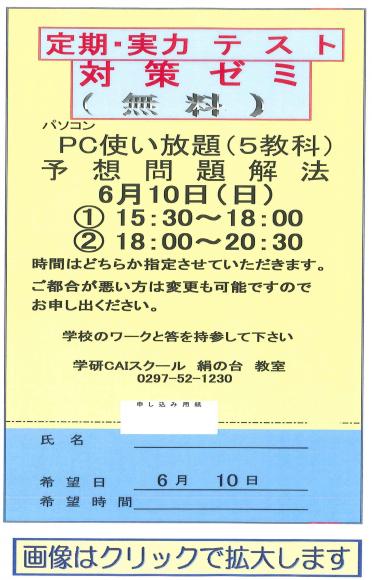 《画像は、クリックすると拡大します》 《 無料:期末テスト対策授業のお知らせ 》 期日 6月10日(日) 時間 1回目 15:30〜18:00 2回目 18:30〜20:00 学校のワークと解答を持参して下さい