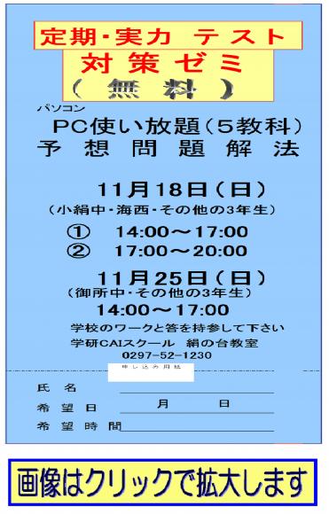 《画像は、クリックすると拡大します》 《 無料:期末テスト対策授業のお知らせ 》 期日 11月18日(日) 時間 1回目 14:00〜17:00 2回目 17:00〜20:00 期日 11月25日(日) 時間 1回目 14:00〜17:00 学校のワークと解答を持参して下さい