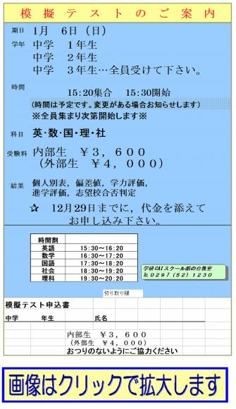 模試開催:中3生県立対策・中1〜2生最終回 ( 教室からのお知らせ )
