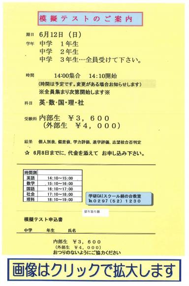 《 茨統模試開催 のお知らせ:中学生 》