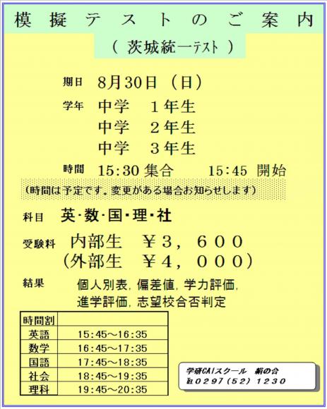 2015年08月28日 金曜日 つくばみらい市・守谷市の中学生 城一模試 開催 ( 教室からのお知らせ ) |
