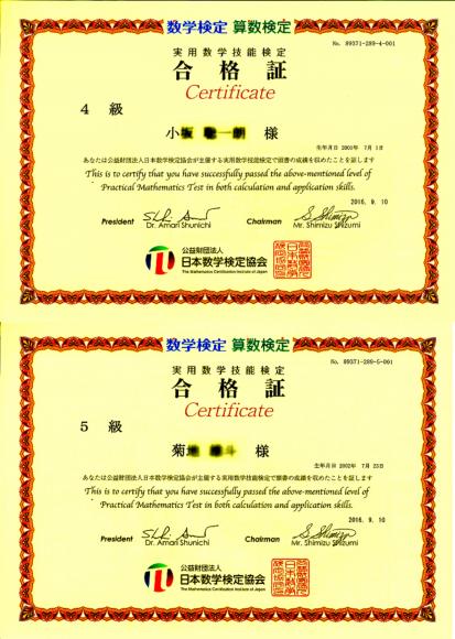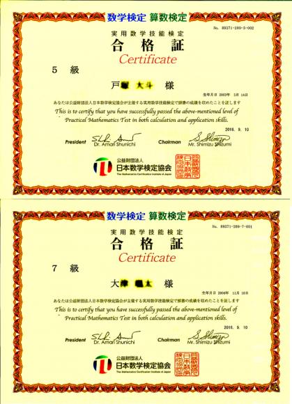こんにちは、学研CAIスク-ルです。 8月実施の数学検定の結果です。 受験者全員合格(1次。2次合格含む)しました。 みんな、よく頑張りましたね。 特に中3生は内申に反映します、 今回受験しなかった 3年生も、もう1回チャンスがあります、 是非挑戦して下さい。 数検も漢検、英検もそうですが 勉強して合格した子供たちは その後の授業態度が変わります。 ご家庭の皆さん、お子様のモチベ-ション アップに 各種検定試験をご利用下さい。 I君 I君 すごい 準2級合格 Mさん Yさん 3級合格おめでとう 10月に1次再挑戦だ K君 K君 まだ学校で勉強していない範囲、頑張りました T君 O君 まだ学校で勉強していない範囲でも好きだから 頑張れますね