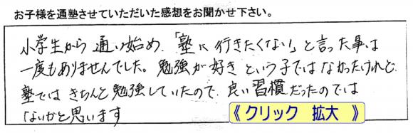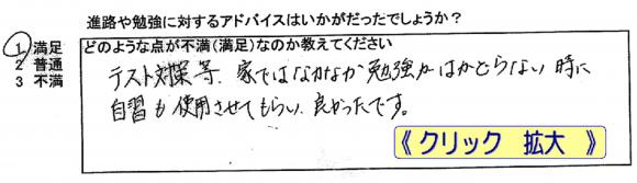 《 画像は、クリックすると拡大します 》 28年度:卒業生へのアンケ−ト Oさんのお母さん ★ 料金は、いかがだったでしょう。 『個別指導で、とても丁寧に教えていただき、ちょうど良い 料金だったと思います。』 ★ 進路や勉強に対するアドバイスは如何だったでしょうか。 『テスト対策等、家ではなかなか勉強がはかどらない時に 自習も使用させてもらい、良かったです。』 ★ スタッフの日々の対応は如何だったでしょうか。 『親には相談できない事なども対応していただき とても助かりました。』 ★ おこさまを通塾させて頂いた感想をお聞かせ下さい。 『小学生から通い始め、《 塾に行きたくない 》と言った事は 一度もありませんでした。勉強が好きという子ではなかった けれど、塾ではきちんと勉強していたので、良い習慣になった のではないかと思います。』 ありがとうございます、皆様に満足頂けるよう さらに努力して参ります。