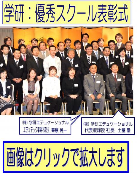 《 学研:優秀スク-ル表彰式 》 全国の学研のスク-ルの中で上位40校に選ばれ ました。 授賞式では、トップ教室の先生の体験談、実績の まざましい教室の事例発表がありました。 20年前に教室を開校した時には、学研や、 本部センタ-で泊りがけも含めて何週間も研修や 講義を受けましたが、恥ずかしながら当時は 頭でしか理解できませんでした。しかし 今では先生方が日々どんなに努力や苦労を 積み重ねているか、ひしひしと分かります。 やはり全国でトップになる先生や事例発表に 選ばれる教室は違います。 お客様である子供たち、ご家庭に対 する心遣い、気配りが素晴らしいと改めて 考えさせられました。 私もここ絹の台で、勉強させていただ けるのも地域の皆様のおかげであり、もっと もっと、子供たちのために頑張らなければ いけない。改めて初心に戻らねばと考え させられた1日でした。 これからも、つくばみらい、守谷、 常総の子供たちのためにさらに頑張って 参ります。