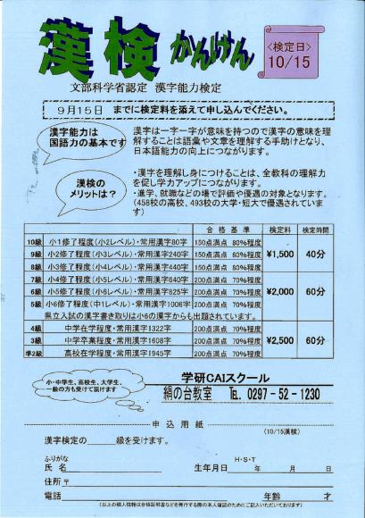 《 画像は、クリックすると拡大します》 『 29年10月漢検受付のお知らせ 』 実施日 10月15日(日) 締め切り 9月15日(金) 試験会場 学研CAIスク-ル 絹の台教室 受検級と費用は申し込み書をご覧ください。 詳細は、お電話でお問い合わせください。 TEL 0297-52-1230