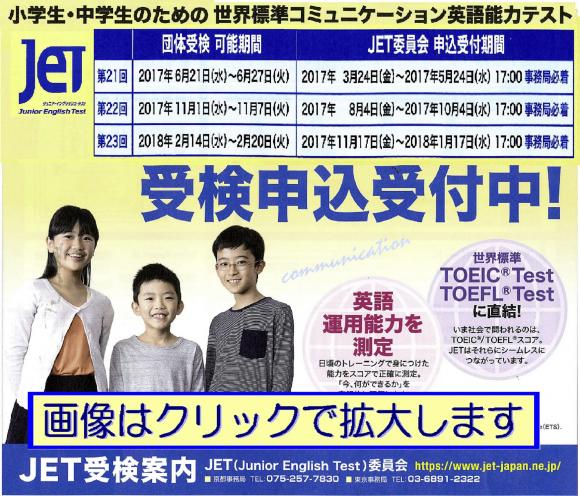 2017年09月13日 水曜日 JET:(TOEICへ直結)子供英語能力判定試験 ( 教室からのお知らせ )