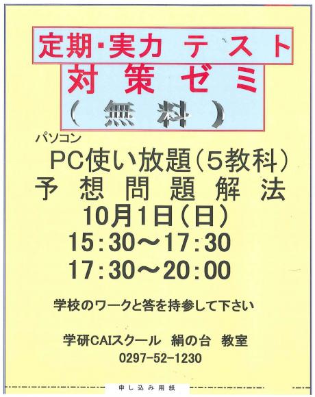 《画像は、クリックすると拡大します》 《 無料:中間テスト対策授業のお知らせ 》 期日 10月1日(日) 時間 第一回 15:30〜17:30 時間 第二回 17:30〜20:00 学校のワークと解答を持参して下さい