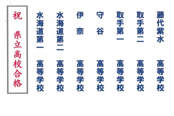 《 29年度 受験合格実績 》 私立高校合格 県立高校合格 みんなよく頑張りました 塾に残る方も、卒業する方も 努力すれば、必ず報われるという 経験を忘れずに、これからもさらに 頑張ってください。 もし困ったことがあったらいつでも 相談に来てください。学研はいつでも 君達の味方です。 本当によく頑張りました おめでとうございます。