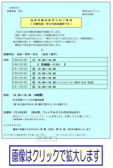 《 県立入試合格対策 =日曜特訓:理社= 》 期日 1月20日〜3月3日 6講座 時間 14:30〜18:30 全員志望高校合格を目指して、頑張ろう! 詳細はお電話でお問合せ下さい。 TEL 0297-52-1230