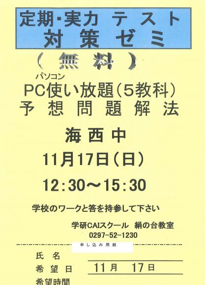 2019年11月16日 土曜日 常総市 海西中:無料定期試験対策 ( 教室からのお知らせ )