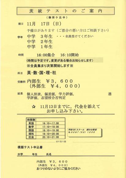 守谷市の中学生:茨統テスト開催のお知らせ ( 教室からのお知らせ )