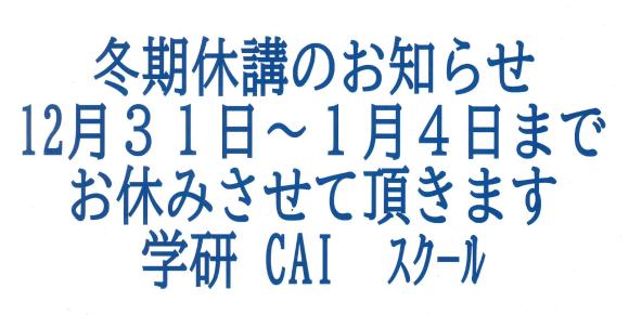 『冬期休講のお知らせ』 R7年中は大変お世話様になりました。 スタッフ一同、御礼を申し上げます。 年末年始は、 12月3 まで、お休みさせて頂きます。 宜しくお願いいたします。 また、新年R8年も変わらずご支援頂けますよう 努力して参ります。 宜しくお願いいたします。 学研 CAI スク-ル
