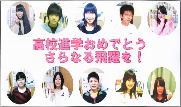 こんにちは、学研CAIスク-ルです。 卒業生のみんな、高校進学おめでとう。 春の嵐もすぎ、穏やかに入学式を 迎えられたのも、みんなの努力が 報われたからでしょう。 これからは、中学で学んだ知識を さらに生かして、高校で大きく 羽ばたいて下さい。 CAIスク-ルでは、高校コ-スもありますから、 もし勉強が難しくなったら 学研でまた勉強して下さい。 高校では、自由も増しますが 自己責任も増大します。 厳しく自分を律して、素晴しい高校生活を 送って下さい。 頑張れ、新高校生!