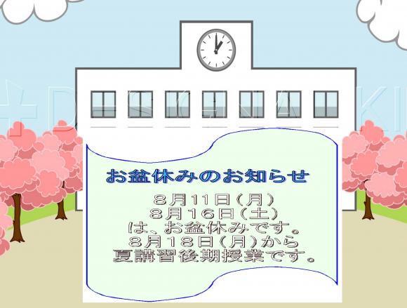 =お盆休みのお知らせ= 8月11日(月)〜8月16日(土) は、夏期休講させて頂きます。 8月18日(月)から 夏講習後期授業を行います。 緊急のご用件は、 Tel 03−6491−1335 学研FC本部へご連絡下さい。