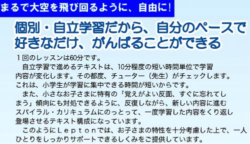 ![]() レプトン会員様には、インタ-ネットで 学習された内容、単語、発音をご家庭で 学習できる、E-ラ−ニングのサ−ビスを 配信しております。 |